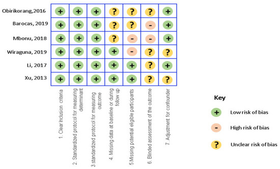The selected studies were critically appraised on seven items: clarity of inclusion criteria, standardization of measurement of determinant, standardization of measurement of outcome, missing data at baseline or follow-up; missing data on potential eligible participants, and blinding and adjustment for confounders. Bias risk was assigned as low risk, high risk, or unclear using an adapted Cochrane collaboration tool. A risk-of-bias summary is presented in Figure 2.