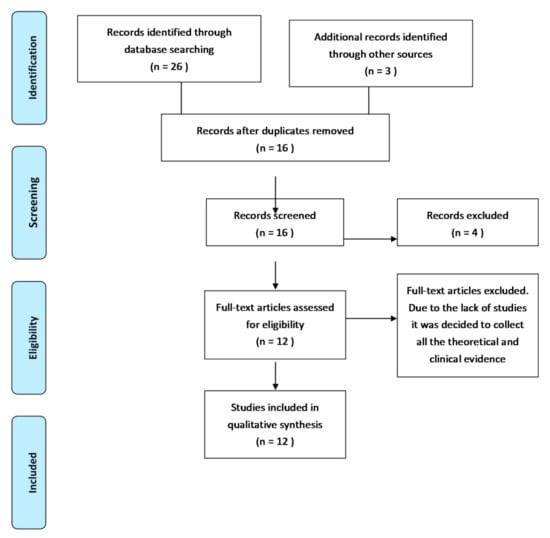 The electronic search yielded 29 articles, which were reduced to 16 after the exclusion of duplicates. After title and abstract screening, 4 articles were excluded and 12 were selected for full text reading. A total of 12 studies were included in the review (Figure 1).