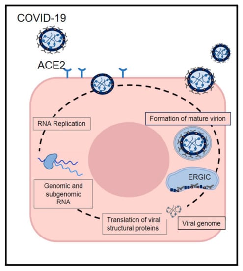 According to recent studies, 14 days is the common duration for the medical observation and quarantine of exposed persons [,]. The common clinical features of COVID-19 include fever, fatigue, dry cough, and myalgia; atypical symptoms, such as headache, anosmia, abdominal pain, diarrhea, and nausea are also observed []. The onset of disease may lead to progressive respiratory failure due to alveolar damage and even death []. Recent studies indicate that angiotensin-converting enzyme II (ACE2) is likely the target receptor of COVID-19, the same host receptor for SARS-CoV-1 and NL63 [,]. The coronavirus S protein can bind to host receptors to facilitate viral entry into target cells, and cellular serine proteases are used for S protein priming. Moreover, it has been demonstrated that overexpressing ACE2 from different cellular lines of HeLa cells allows for COVID-19 infection and replication [,]. Nevertheless, COVID-19 does not use other coronavirus receptors but is similar to SARS-CoV-1, which might translate into similar transmissibility and disease pathogenesis [,]. Moreover, studies on the biology of viral infection and clinical disease management have demonstrated that differences in COVID-19 prevalence and severity are associated with the high affinity of COVID-19 S protein for ACE2, suggesting that populations with higher expression of ACE2 might be more susceptible to COVID-19 infection [,] (Figure 2).