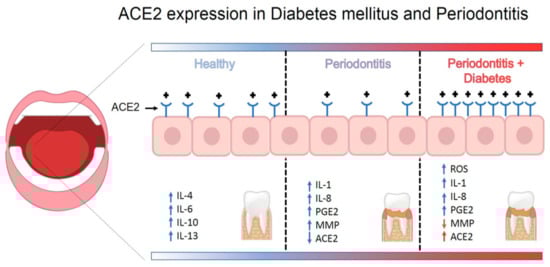 Inflammation and oxidative stress are also key regulators in the manifestation of diabetes mellitus and PD. Periodontal infection can therefore induce systemic inflammation, which in turn builds up or reinforces chronic insulin resistance. During COVID-19 infection, ACE2 expression is decreased, and this results in an exaggerated activity of Ang II with subsequent insulin resistance, oxidative stress, inflammation, hypertension, and cardiac dysfunction [].
