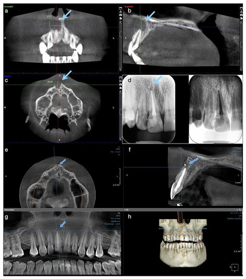 Case 1. Radiological investigations for tooth #11: (a–c) Initial CBCT scans with the measurements of the lesion’s size, indicated by blue arrows: mesiodistal diameter 9.75 mm, height 9.31 mm, buccolingual diameter 10.36 mm, with the interruption of the cortical buccal plate (9.75 × 9.31 × 10.36 mm); (d) control periapical X-ray at 6 months, showing the quality of the endodontic treatment and almost the complete healing of the lesion; (e–g) CBCT scans at 12 months showing the intact buccal cortical plate, the formation of new bone, and the almost complete healing of the lesion. A small enlargement of the periodontal ligament space is still observed apically, (h) 3D reconstruction where intact maxillary bone is observed.