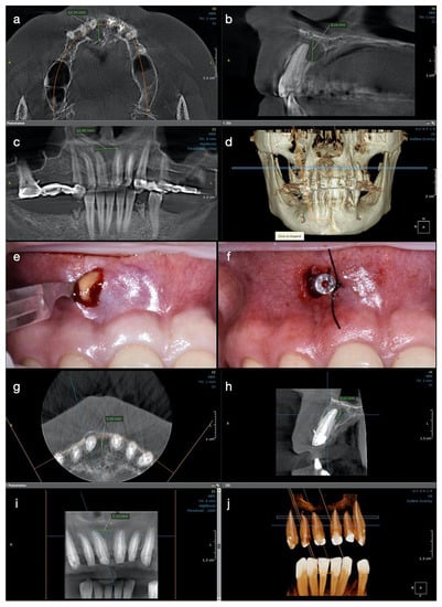 Case 2. Radiological investigations and clinical images of tooth #11: (a–d) Initial CBCT scans with the measurements of the lesion size: 12.10 mm in buccolingual direction, 8.26 mm in height, and 12.49 mm mesiodistal diameter, with the buccal cortical plate resorbed (12.10 × 8.26 × 12.49 mm); (e,f) The surgical procedure of decompression at the end of the endodontic treatment with the appearance of yellow fluid draining from the lesion, and the drainage tube fixed with sutures on the mucosa; (g–j) CBCT scans and the 3D reconstruction at 6 months after the endodontic therapy, with the formation of new bone and increased reduction of the lesion size, starting from its periphery (5.88 × 5.10 × 7.70 mm).