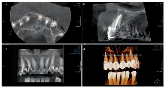 The size of the lesion was measured using the measurement tools of OnDemand3D (OP 3D™ Pro, KaVo Dental GmbH) and was about 15 mm in height, 13 mm in the buccolingual direction, and 13 mm in the mesiodistal. The lesion appeared well contoured by a thin radiopaque border line on all its contours, communicating with the apex of tooth 11 in its inferior part (presumptive diagnosis of pocket cyst) (Figure 2a–d). In addition, on the CBCT scan, teeth #21 and 22 appeared to be endodontically treated, with a radio-opaque obturation material present in the root canal space, 3 mm shorter from the radiographic apex for tooth #21 and 2 mm shorter for tooth #22. A small area of radiolucency of about 1 mm diameter around the apex of tooth #22 was also observed.