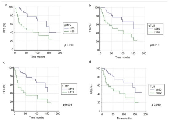 PFS curves according to pretreatment gMTV (a), gTLG (b), tMTV (c), and TLG (d) threshold.