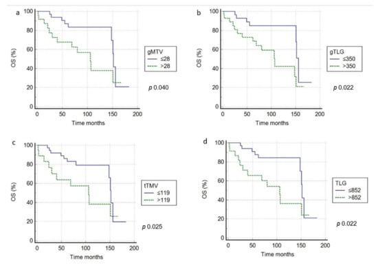 OS curves according to pretreatment gMTV (a), gTLG (b), tMTV (c), and TLG (d) threshold.