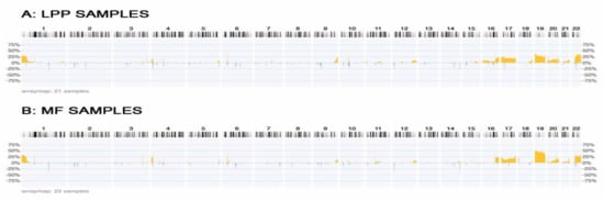 Recurring and important duplications affect chromosomes 16, 17, 19, 20, 21 and 22, on large portions of DNA, as previously described in the literature []. MF cases seem to be more frequently affected by these gains than LPP cases.