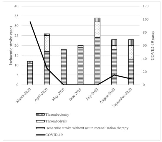 Figure 1. Number of ischaemic stroke cases during the COVID-19 pandemic. Data for COVID-19 positive cases over time in Penang was available for the period beginning in March 2020 and ending in September 2020 (http://covid-19.moh.gov.my/, accessed on 1 May 2021).