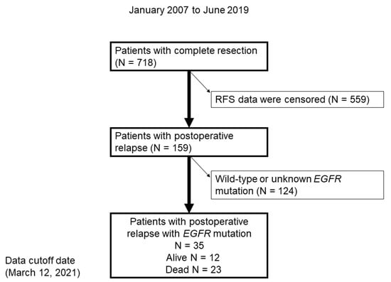- Ito, M.; Miyata, Y.; Tsutani, Y.; Ito, H.; Nakayama, H.; Imai, K.; Ikeda, N.; Okada, M. Positive EGFR mutation status is a risk of recurrence in pN0–1 lung adenocarcinoma when combined with pathological stage and histological subtype: A retrospective multi-center analysis. Lung Cancer 2020, 141, 107–113. [Google Scholar] [CrossRef] [PubMed]
