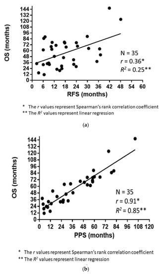- Imai, H.; Mori, K.; Ono, A.; Akamatsu, H.; Taira, T.; Kenmotsu, H.; Naito, T.; Kaira, K.; Murakami, H.; Endo, M.; et al. Individual-level data on the relationships of progression-free survival and post-progression survival with overall survival in patients with advanced non-squamous non-small cell lung cancer patients who received second-line chemotherapy. Med. Oncol. 2014, 31, 88. [Google Scholar] [CrossRef] [PubMed]