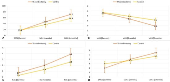 The thrombectomy group showed significant improvements in mRS with time, compared to the control: values for two weeks, four weeks, six months; 4.6, 3.4, 1.9 for thrombectomy, 4.7, 3.9, 3.1 for control (all p < 0.05, Table 2, Figure 1). The thrombectomy group showed significant improvements in FAC values with time, compared to the control: values for two weeks, four weeks, six months; 0.7, 2.0, 3.9 for thrombectomy, 0.3, 1.3, 2.6 for control (all p < 0.05, Table 2, Figure 1). The thrombectomy group showed significant improvements in DOSS values with time, compared to the control: values for two weeks, four weeks, six months; 3.0, 5.0, 6.5 for thrombectomy, 4.0, 4.7, 5.7 for control (all p < 0.05, Table 2, Figure 1).