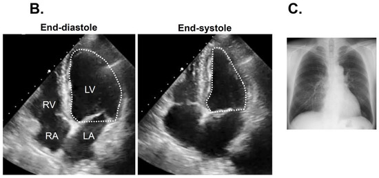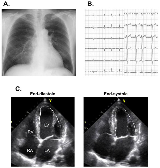 Chest X-ray showing 47% of cardiothoracic ratio (A), electrocardiogram showing atrial fibrillation (B), and transthoracic echocardiography showing reduced left ventricular ejection fraction on admission (C) on admission. LA, left atrium: LV, left ventricle; Ao, ascending aorta; RA, right atrium; RV, right ventricle.