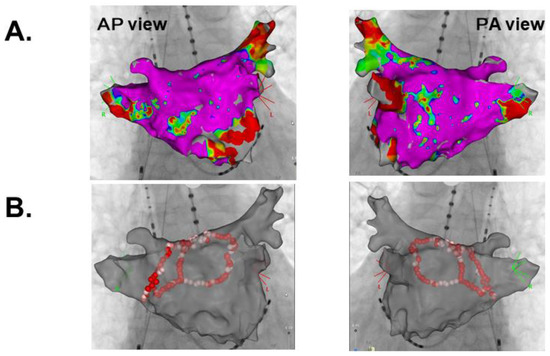 Left atrial voltage mapping (A) and ablation lines (B). AP, Anterior Posterior; PA, Posterior Anterior.
