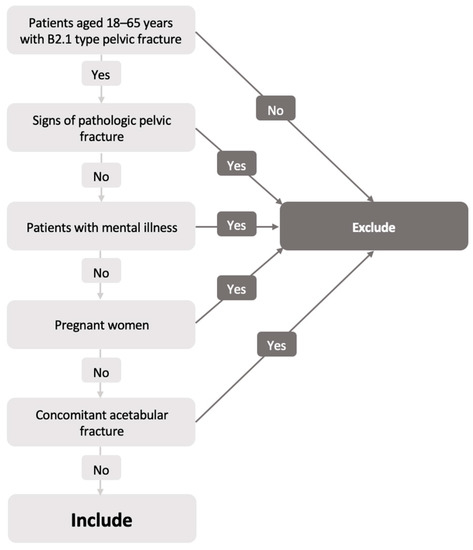 Patients aged 18 to 65 years with pelvic B2.1 type fractures that were hospitalized in a single trauma center between 2016 November and 2019 September were included in the research. Patients older than 65 years or with pathologic pelvic fractures, pregnant women, patients with mental illnesses, and those with a concomitant acetabular fracture were excluded (Figure 1).