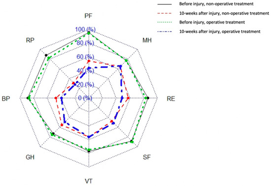 Percentage differences between results of SF-36 domains for operatively and non-operatively treated patients between timepoint I and timepoint II (PF—physical functioning; RP—role-physical; BP—bodily pain; GH—general health; VT—vitality; SF—social functioning; RE—role-emotional; and MH—mental health).