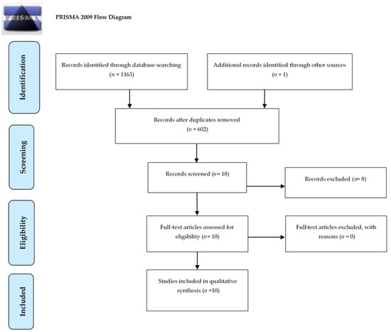 Selection process is summarized by the flow-chart reported in Figure 1. The results of the search in the three different databases provided 18 studies. From these 18 studies, 10 of them met the inclusion criteria. Nine of the 10 studies focused on analyzing the expression of the entry molecules of SARS-CoV-2 in oral cells and tissues. The entry molecules studied in these 9 studies were: ACE2, TMPRSS2, TMPRSS3, TMPRSS4, TMPRSS5, TMPRSS7, TMPRSS11D and furin. In only one of the 10 studies were both human and mouse samples analyzed. Only one study focused on identifying the presence of SARS-CoV-2 in oral tissues by means of PCR. The study design most used was “in silico”, followed by “in vivo” and finally “in vitro” [,,,,,,]. Most of the articles showed a combination of two or more of the aforementioned study designs.