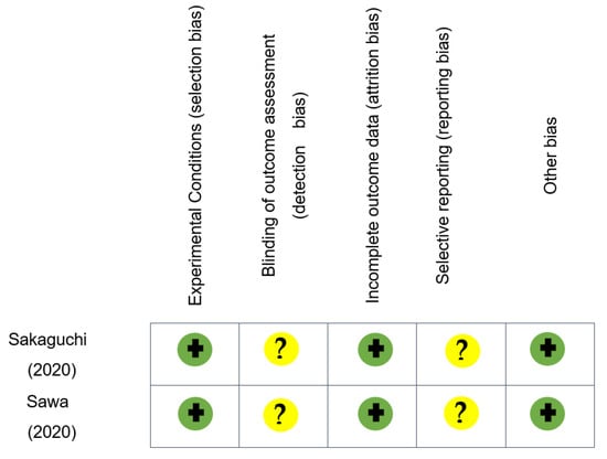 Risk of bias for each of the included in vitro studies (n = 2). The green circles with plus signs indicate a low risk of bias; the yellow circles with a question mark indicates an unclear risk of bias in the studies.