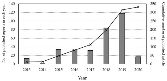 Literature search of the database resulted in inclusion of 332 news reports related to brain organoid research. The timeline of the publication is demonstrated in Figure 1. The first report was published in 2013, when Lancaster et al. reported the establishment of human pluripotent stem cell-derived 3D cerebral organoids [1], and the number of related news reports has gradually increased every year since then.