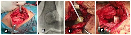 Surgical treatment was indicated, together with intra-operative culture (Figure 2C) and specific long term antibiotics after surgery. Open debridement was performed (Figure 2A,D) using an antero-lateral approach to the knee with lateral fenestration of the distal femur under fluoroscopy control (Figure 2B) to directly access the cavity of the abscess and posterior approach to the popliteal region for soft tissue debridement. Antiseptic solutions in large quantities and local antibiotics were used for proper local debridement, before drying the cavity to allow for its correct filling with bone inducing cement.