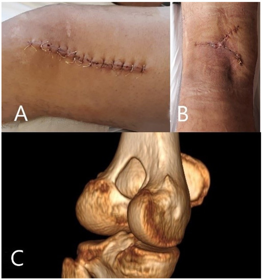 (A) Anterolateral incision with normal healing and no sign of septic complications. (B) Posterior scar used for soft tissue debridement. (C) CT reconstruction after surgery showing post-operative aspect with bone inducing cement filling the remaining bone defect.