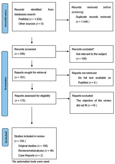 The search provided 1835 results. The overlapping studies (1546) were excluded. All references retrieved from the databases were screened based on their titles and abstracts (289). Subsequently, full texts of potentially eligible articles were further evaluated (181). All references within the included studies and those of any previous pertinent reviews were carefully reviewed to identify additional relevant studies. A total of 16 were excluded because they did not fit the objective of the review and six were excluded because the complete manuscript was not available as full text on PubMed. The final number of records included was 159. Among these, 108 were original studies (RCTs, longitudinal open-label studies, and retrospective studies), while 49 were reviews/meta-analyses and two were case reports. Figure 1.
