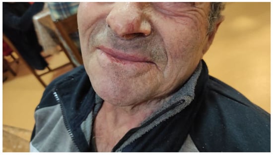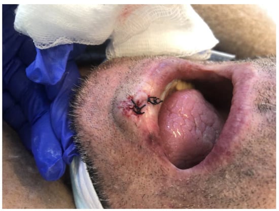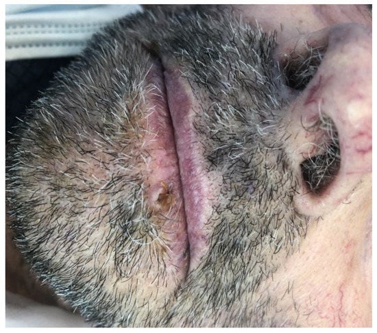 Head and neck cancer is a term used to define malignant tumors developing on the lips, mouth, nose, and other head and neck areas []. The majority of these tumors are squamous cell carcinomas (SCC) []. SCC is a tumor characterized by an abnormal and quick growth of keratinocytes in the epidermis []. Although this kind of tumor is usually associated with ultraviolet light exposure and tobacco and alcohol use, this type of cancer may be linked to a previous human papilloma virus (HPV) infection in up to 25% of cases []. Although the oropharyngeal region is usually the most frequently associated with HPV infection, SCC affects other regions, such as the lip and the tongue, have been associated with this viral infection in up to 37% []. Interestingly, types 16 and 18 HPV are usually related to this type of tumor, as it happens in cervical cancers [,]. HPV 16 accounts for 90% of cases. HPV-associated cancers tend to have increased survival and better outcomes [], although SCC affecting the perioral region tends to have a worse prognosis than other types of SCC [].