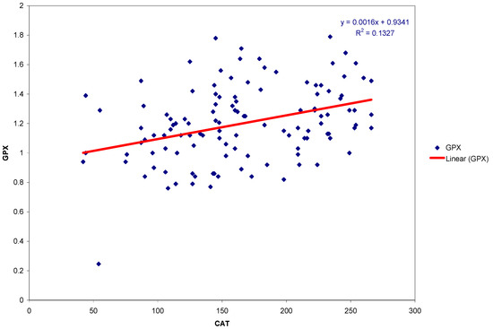 The scatter plot and linear regression of GPX and CAT activity in the group of subjects with gingivitis are presented in Figure 1.