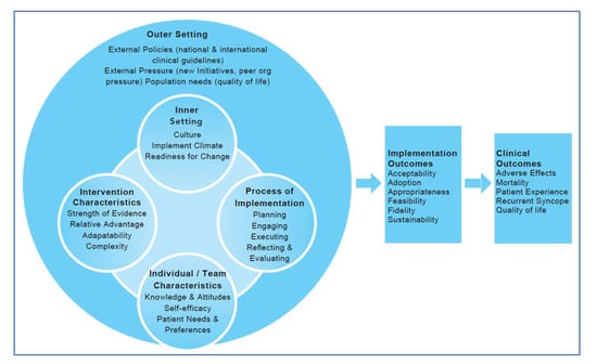 The Consolidated Framework of Implementation Research (CFIR) [32] is commonly used to guide the design, implementation and evaluation of strategies. CFIR was deemed to meet the needs of our project, as a determinant framework that can be used to identify determinants (i.e., barriers and facilitators) thought to affect the likelihood of a clinical guideline being translated into routine care and influence the implementation process at different levels (from the user to the program provider, to the organizational level) [33]. In Figure 1, we delineate the possible influencing factors for syncope clinical practice guideline (CPG) adoption and implementation through multi-stakeholder effort. The effectiveness of a multicomponent, multilevel implementation strategy will be mediated by the fidelity with which the intervention is delivered, and patient outcomes will be moderated by several patient-level factors. The entire process occurs within a context composed of system-level, organizational-level, and provider-level factors known to influence the implementation of a CPG [34].