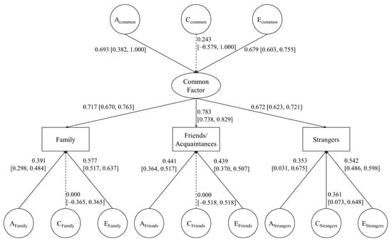 The likelihood ratio test suggested that the CP model did not significantly harm the fit to the present data compared to the IP model. Additionally, despite a slightly lower CFI value than that of the other two models, the CP model showed a better fit to the data based on AIC, BIC, and RMSEA (Table 3). Therefore, it was selected as the best-fit model (Figure 1). Figure 1 shows the results for the CP model. There was no significant contribution of shared environment to a common factor, altruism toward family members, or altruism toward friends/acquaintances. Only altruism toward strangers had a significant effect on the shared environment.