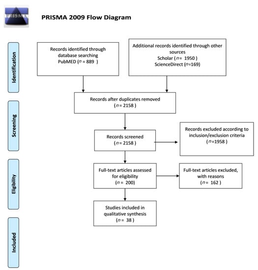 Articles were selected online in relation to the title and abstracts; articles were read in full when titles and abstracts were consistent with the objective of our study. Following this procedure, we found 889 articles on the PubMed database, 1950 articles on Scholar and 169 articles on ScienceDirect; after applying the inclusion and exclusion criteria, the total number of relevant publications was reduced to 38.