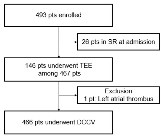 In order to rule out structural heart disease in all patients, trans-thoracic echocardiography (TTE) was performed within the 6 months prior to DCCV. Additionally, intra-cardiac thrombi were ruled out via trans-esophageal echocardiography (TEE) within 24 h prior to DCCV in all patients. Blood samples for serologic assays were collected and optimal anticoagulation was established before DCCV was performed. The research protocol complied with the principles of the Declaration of Helsinki and was approved by the Institutional Review Board of the Korea University Anam Hospital (2017AN0163).