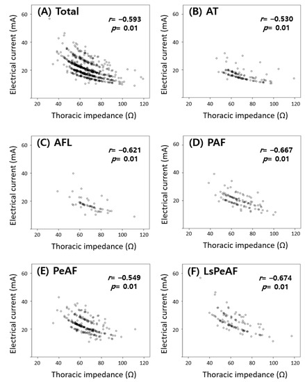 The relationship between electrical current and thoracic impedance for (A) all patients and patients with (B) atrial tachycardia, (C) atrial flutter, (D) paroxysmal atrial fibrillation, (E) persistent atrial fibrillation, and (F) long-standing persistent atrial fibrillation. As the thoracic impedance increases, the electrical current decreases.