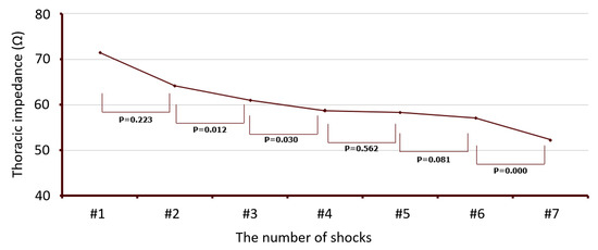 In Figure 2, the correlation between the therapeutic dose of electrical current and the thoracic impedance at the time of successful SR restoration is shown. In all patients, the electrical current delivered was inversely proportional to the thoracic impedance, regardless of the energy level that was delivered (correlation analysis, r = −0.593, p < 0.01). This correlation between the electrical current and thoracic impedance was similar in each arrhythmia-type group (AT group r = −0.53, AFL group r = −0.621, PAF group r = 0.667, PeAF group r = −0.549, LsPeAF group r = −0.674, p of all groups <0.01). The changes in impedance with repeated shocks (energy delivery) were measured in the patients who underwent more than three shocks (137 cases out of 683 total cases, 20%). The thoracic impedance gradually decreased as the shocks were repeated (paired t-test, Figure 3).