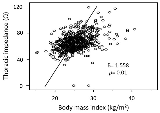 Among the differences in arrhythmia types, ages of the patients, sex, BMI, BSA, LAD, LV EF, LVMI, and amiodarone use, the multivariate linear regression analysis showed that sex and BMI were the only factors associated with increased thoracic impedance. Notably, thoracic impedance was significantly higher in female patients than in male patients (77 ± 15 Ω vs. 63 ± 11 Ω, p = 0.01). Impedance was also increased in patients with higher BMIs (linear regression, B = 1.558, p = 0.01) (Figure 4). Interestingly, thoracic impedance was not affected by arrhythmia type, age, BSA, LAD, LVMI, or amiodarone use.