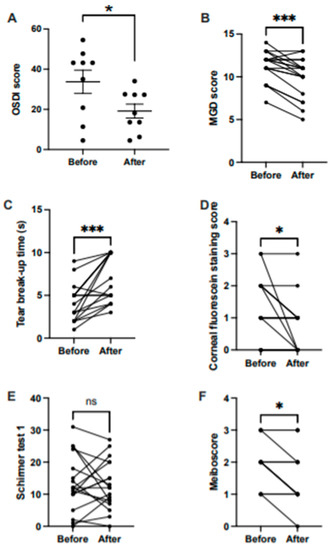 Treatment effect before and after treatment on (A) OSDI score (horizontal bars represent means, and error bars represent the standard error of the mean, SEM); (B) MGD score; (C) tear break-up time; (D) corneal fluorescein staining score; (E) Schirmer 1 test; and (F) meiboscore. Lines shown in B, C, D, E, and F represent outcomes before and after treatment. s, seconds. * p < 0.05; *** p < 0.005; ns, non-significant.