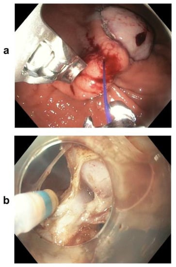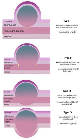 - Białek, A.; Wiechowska-Kozłowska, A.; Pertkiewicz, J.; Polkowski, M.; Milkiewicz, P.; Karpińska, K.; Ławniczak, M.; Starzyńska, T. Endoscopic submucosal dissection for treatment of gastric subepithelial tumors (with video). Gastrointest. Endosc. 2012, 75, 276–286. [Google Scholar] [CrossRef]