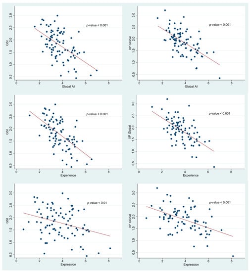 The results revealed that low AI scores were strongly associated with high levels of symptom distress and relational difficulties (see Figure 1). For the GSI, the standardized regression coefficients (correlations) were −0.57 (95% CI [−0.74, −0.38] for Global AI (r2 = 0.33), −0.61 (95% CI [−0.79, −0.44] for Experience (r2 = 0.37), and −0.32 (95% CI [−0.52, −0.11] for Expression (r2 = 0.10). For IIP-Global, the standardized regression coefficients were −0.62 (95% CI [−0.80, −0.44] for Global AI (r2 = 0.38), −0.61 (95% CI [−0.79, −0.44] for Experience (r2 = 0.37), and −0.49 (95% CI [−0.68, −0.29] for Expression (r2 = 0.24).