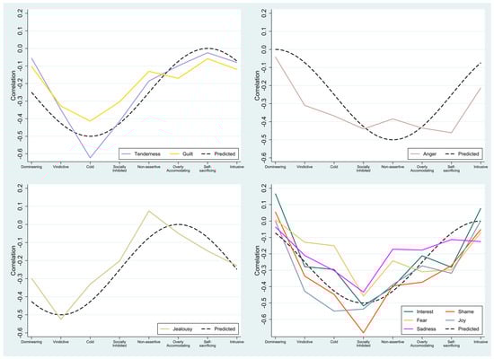 Patterns of relationships between the discrete affects and specific types of interpersonal problems. The predicted patterns are shown as black dashed lines (n = 82).