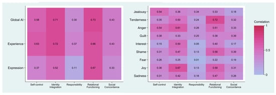 In the examination of the integration of specific affects, which can be seen in Figure 3 (right), we found that Identity Integration had strong or moderate to strong correlations with Tenderness, Anger, Interest, Shame, Sadness, and Joy, moderate correlations with Jealousy and Guilt, and a weak correlation with Fear. Relational Functioning had strong or moderate to strong correlations with Tenderness, Anger, Shame, Sadness, and Joy, moderate correlations with Jealousy, Guilt, and Interest, and a weak correlation with Fear. Self-control had strong correlations with the integration of Jealousy and Anger, moderate correlations with Tenderness, Guilt, Shame, Joy, and Sadness, and weak correlations with Interest and Fear. Social Concordance had moderate correlations with Tenderness, Anger, Guilt, Shame, and Joy and weak correlations with Jealousy, Interest, Fear, and Sadness. Finally, Responsibility had a moderate correlation with Jealousy, small to moderate correlations with Tenderness, Anger, and Guilt, and small correlations with Shame, Sadness, Joy, and Interest.
