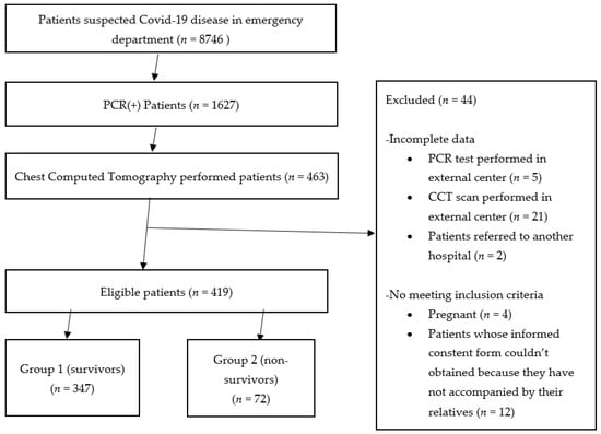 The study form was completed for 463 patients. Fourty-four patients were excluded from the study because the PCR test (five patients) or the CCT scan (21 patients) were performed at an external center, while four patients were pregnant and two were referred to another hospital. Additionally, patients not accompanied by their relatives (12 patients) were excluded from the study because the informed consent form could not obtained from these patients. Of the 419 patients included in the study, 347 (83%) survived (Group 1) and 72 (17%) died in the hospital (Group 2) (Figure 1). The retrospective analysis of the results showed there were 139 (40%) women and 208 (60%) men in Group 1 and 28 (39%) women and 44 (61%) men in Group 2 (p = 0.895). The age of the patients was 51 ± 17 years and 64 ± 1 5 years in Groups 1 and 2, respectively (p = 0.001). There was a difference between the two groups in terms of their complaints when admitted to the ED. In Group 1, 16% of the patients had no complaints but had a history of contact with a COVID-19 patient. In Group 2, 69% of the patients admitted to the ED complained of dyspnea. When the diseases existing in their history were evaluated, it was observed that diabetes mellitus (DM), coronary artery disease (CAD), cancer and stroke were more common in the Group 2 patients. There was no difference between the groups in terms of hypertension (HT) and chronic obstructive pulmonary disease (COPD) diseases (Table 1, Figure 1).