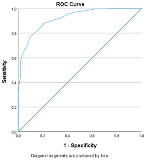 Analysis of the data collected in the study was performed using the Social Sciences 27 statistical software package (SPSS 27(IBM, New York, NY, USA)). The Kolmogorov–Smirnov test was used to determine whether continuous and discrete random variables were normally distributed. Descriptive statistics were given as mean ± standard deviation or as median (interquartile range) for continuous and discrete random variables, whereas categorical variables were given as the number of cases and their percentages (%). Categorical variables were assessed with the chi-squared test, parametric data with the Student’s t-test and non-parametric data with the Mann–Whitney U test and the Kruskal–Wallis H test. By utilizing receiver operating characteristic (ROC) analysis, the area under the curve (AUC) was used to calculate the cut-off value, specificity and sensitivity. To determine the statistical significance and assumptions, p < 0.05 with 95% confidence intervals was considered significant in all analyses. The power analysis was performed using G*Power version 3.1.9.7 (2020) for Windows 10 (Universitat Düsseldorf, Germany), referencing similar studies in the literature. With a power of 0.95 and a type 1 error rate of 0.05, the sample size was calculated as 116.