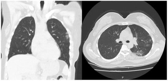 A 45-year-old female patient was admitted to the emergency department with complaint of cough started after 3 days of a diagnosis of COVID-19 disease. She had no chronical disease. Vital signs on admission were fever: 37 °C, pulse rate (PR): 90/min, respiratory rate (RR): 18/min, SpO2:97% and blood pressure (BP): 110/70 mmHg. Laboratory findings were: BE: 0.7 mmol/L, HCO3: 23.2 mmol/L, Lactat: 1.7 mmol/L, WBC: 6.23 (103/µL), Hgb: 12.7 g/dL, RDWSD: 37.4 fL, lym:3.01 (103/µL), eos: 0.14 (103/µL), D-dimer: 162 µg/L, hs-TnI: 0 ng/mL. She was followed and treated at home. She started to work after a 2-week home quarantine.