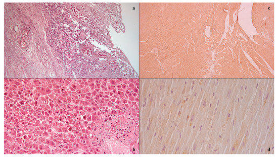Histological investigation: mucosal and submucosal edema, and well-defined agglomerations of inflammatory cells in the context of the bowel wall (a); Councilman bodies of the liver (b); positive anti-IL15 (c) anti-TNF-alpha (d) antibody reactions on heart samples.