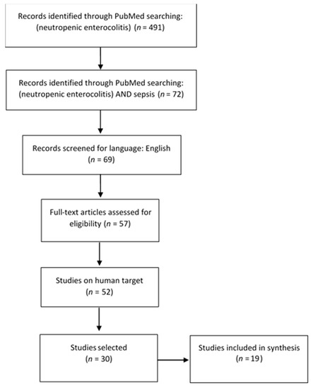 Synthesis: Following these procedures, 30 eligible studies were included in present review. Then potentially relevant studies were further assessed, excluding other-than-neutropenic-enterocolitis entities causing sepsis [20,21,22,23,24,25,26], pediatric subjects [27], and clinical trials [28,29,30]. After this literature review process, 19 papers were selected (Figure 2).