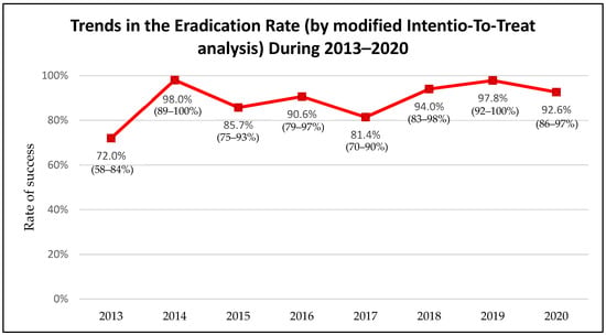 Among 552 cases evaluated after the treatment, the overall effectiveness of H. pylori eradication was 90% (95% CI: 87–92%). Regarding the trends of H. pylori eradication success during the years 2013–2020, an increasing eradication rate from 72% in the year 2013 to more than 90% during the years 2018–2020 (94%, 97.8% and 92.6% respectively) has been observed (Figure 2).