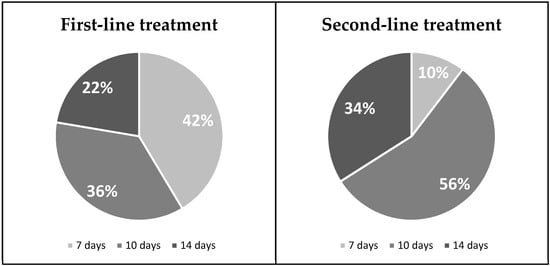 Of all 2000 cases, the average (SD) duration of the H. pylori infection treatment was 10 (2.7) days. The eradication therapy was prescribed for 7, 10 or 14 days and the distribution of treatment duration in first and second-line treatments is presented in Figure 3. The most often prescribed duration was 7 days in more than 40% of first-line therapy patients and was 10 days in more than a half of second line treatment cases. The most frequent duration of H. pylori eradication prescriptions in the years 2013–2017 was 7 days, however, starting from the year 2015 a clear shift to 10 or 14 days treatment durations was observed and from the year 2018 10–14 days treatment durations became the most frequently prescribed. The visual analysis of these changes is presented in Figure 4.