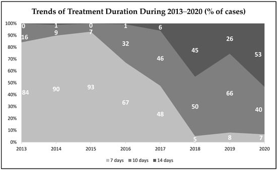 Trends of H. pylori eradication treatment duration during the years 2013–2020.