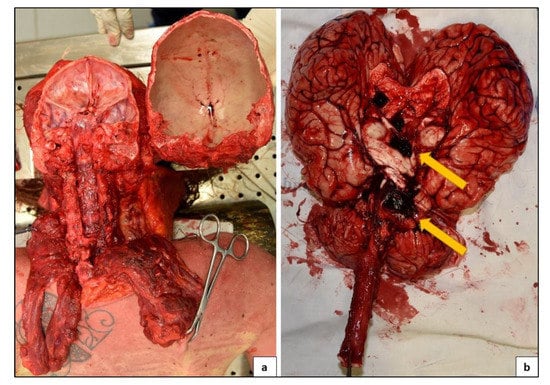 - Racette, S.; Sauvageau, A. Brain arteriovenous malformation and its implication in forensic pathology. J. Forensic Sci. 2007, 52, 189–191. [Google Scholar] [CrossRef]