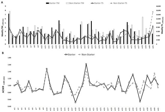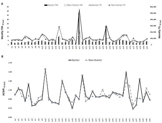 TM, TS (A) and ACWR (B) variations calculated through the total distance across 41 weeks for starters and non-starters.