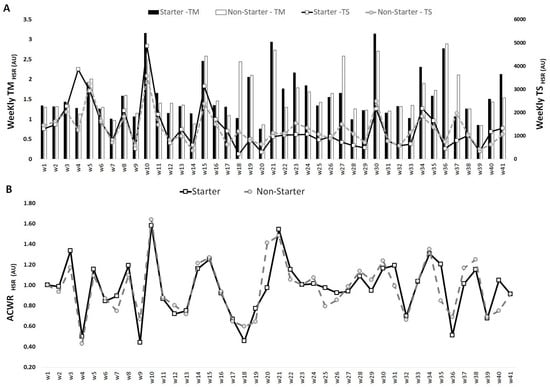 TM, TS (A) and ACWR (B) variations calculated through the HSR across 41 weeks for starters and non-starters.