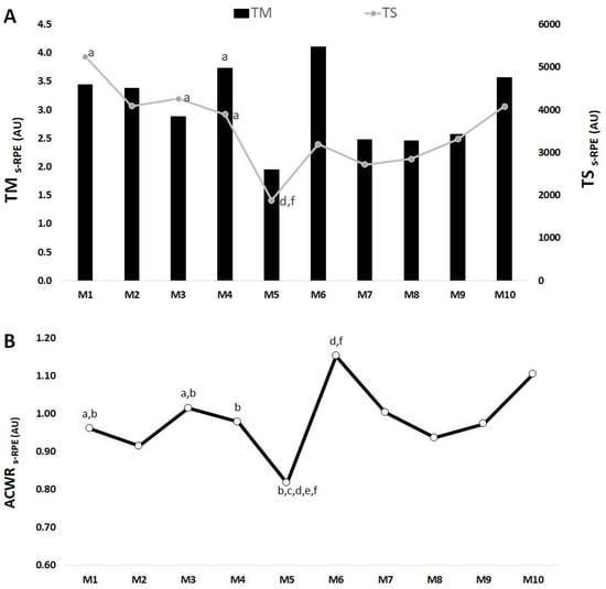 TM, TS (A) and ACWR (B) variations calculated through the s-RPE across 10 mesocycles for the whole team. M: mesocycle; a: difference from M5; b: difference from M6; c: difference from M7; d: difference from M8; e: difference from M9; f: difference from M10.